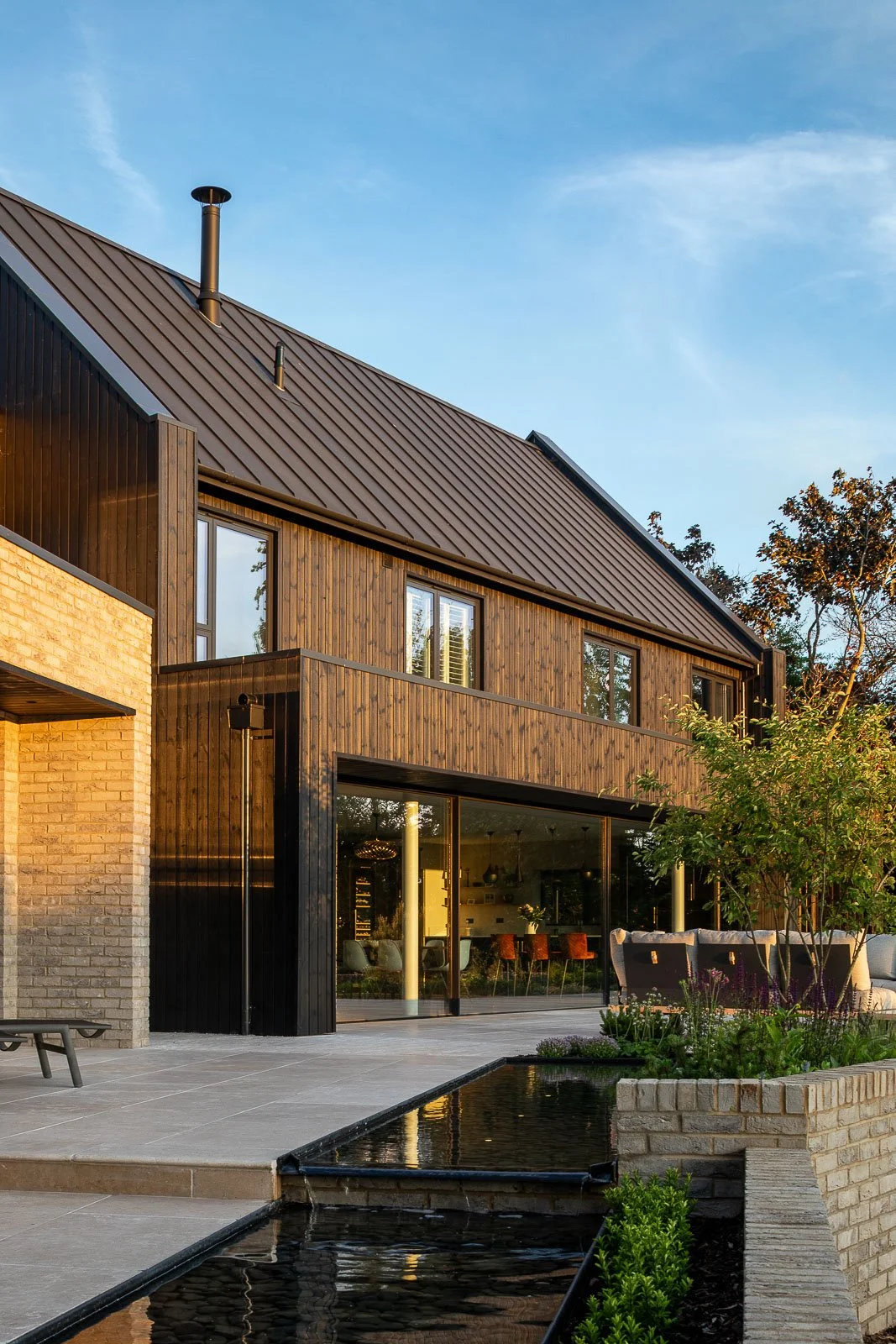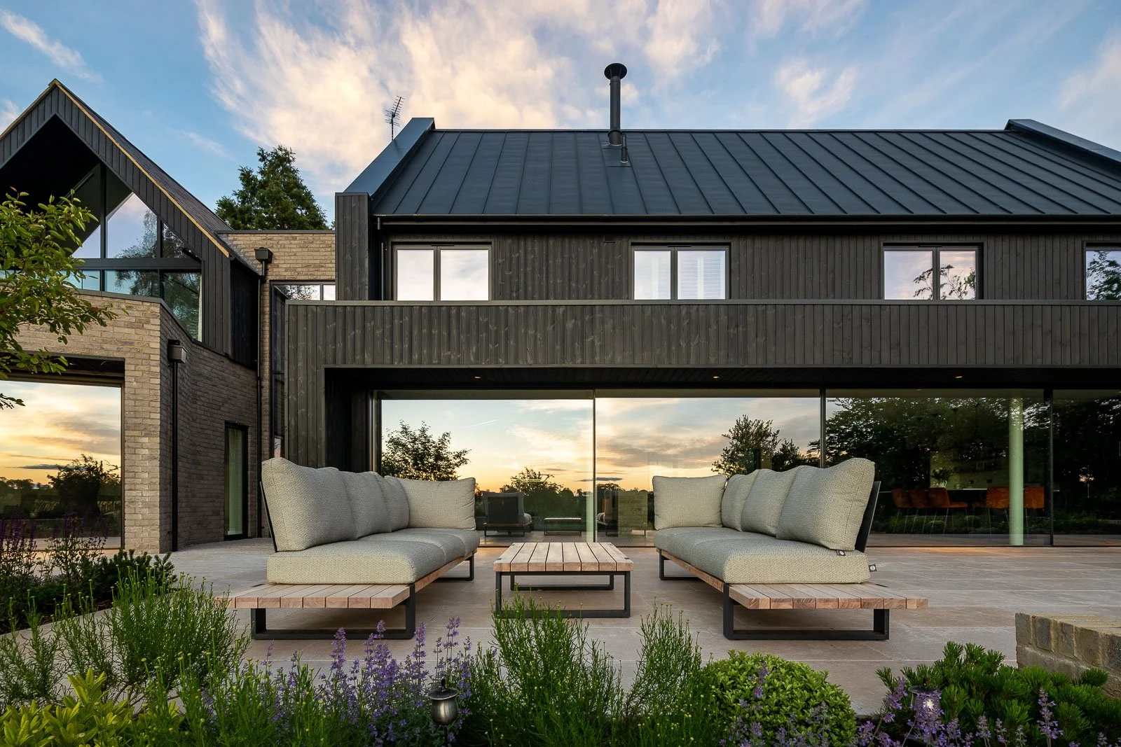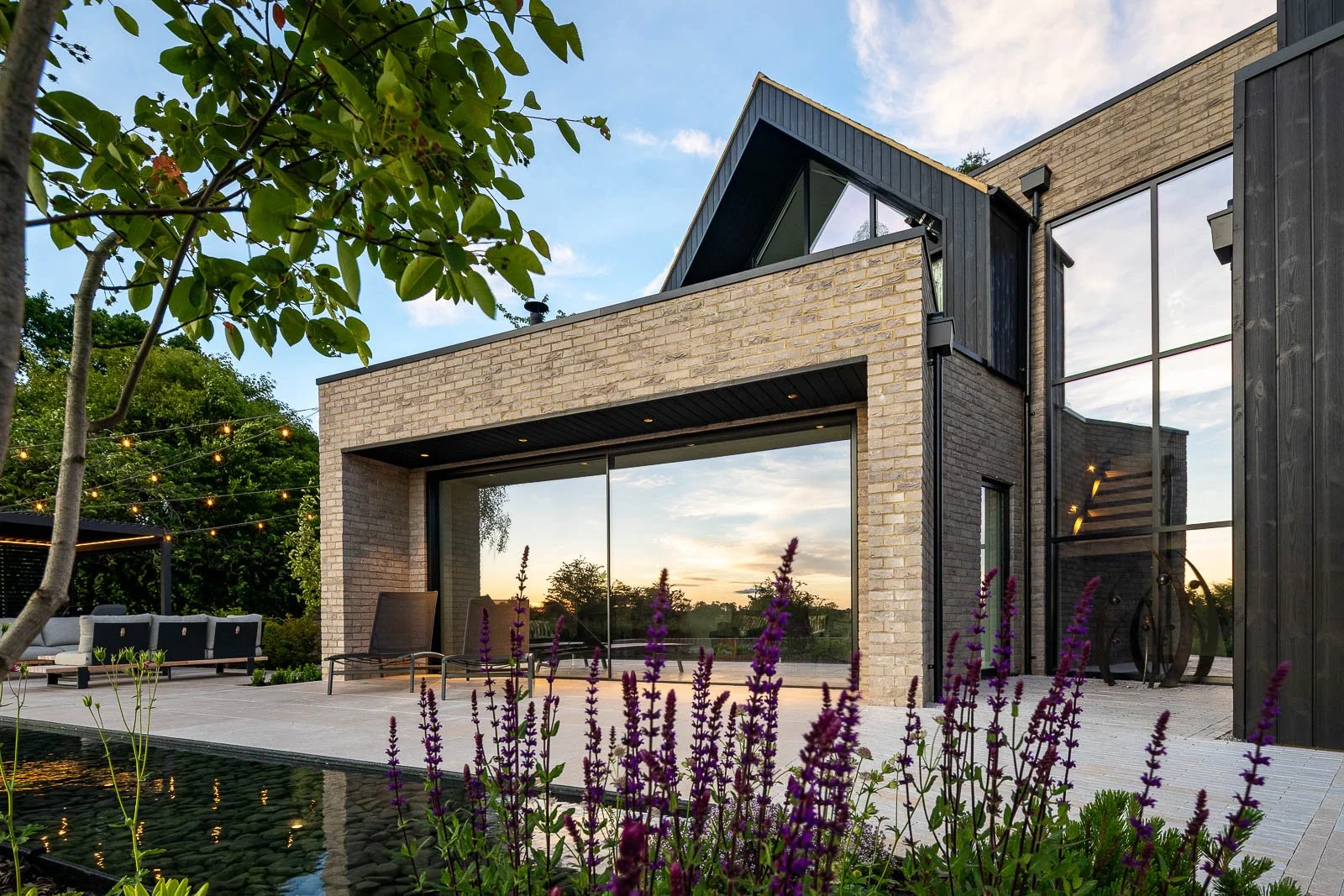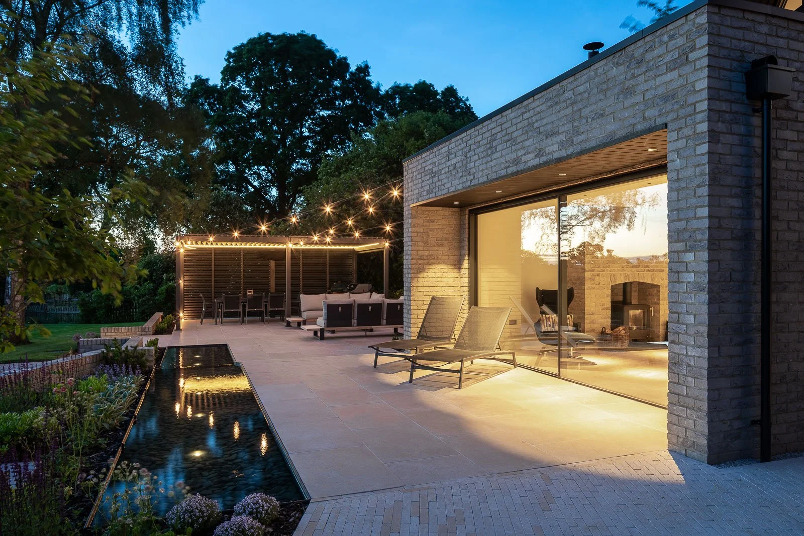 A stunning modern house designed by Leaf Architecture. We were involved from the outset on this project and the results are spectacular. The first part of the brief was to ensure that the views out across the countryside were not interrupted and the extensive use of glass on the house ensured the connection to the garden was of paramount importance to the overall success of the whole project. The garden falls away from the house and a large terrace wraps across the main living spaces. This is broken up with a flat water canal and limestone pavers. To the side of the house is a destination arbour and BBQ space. This makes the most of the views without interrupting them. Multi-stem trees add a layer of height and the planting helps set the building within the countryside setting.