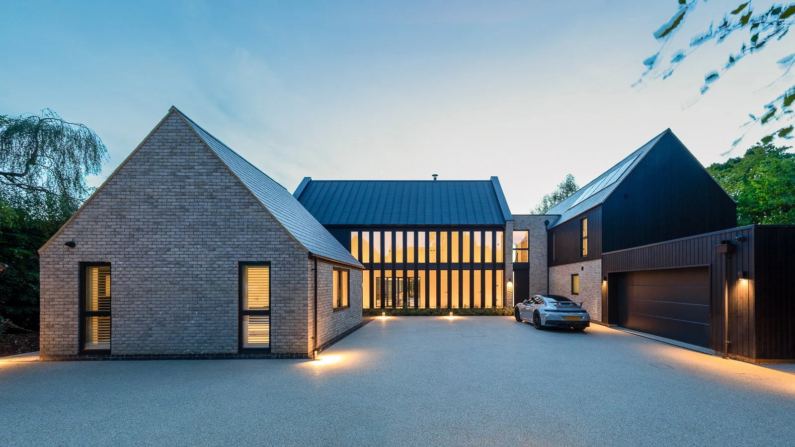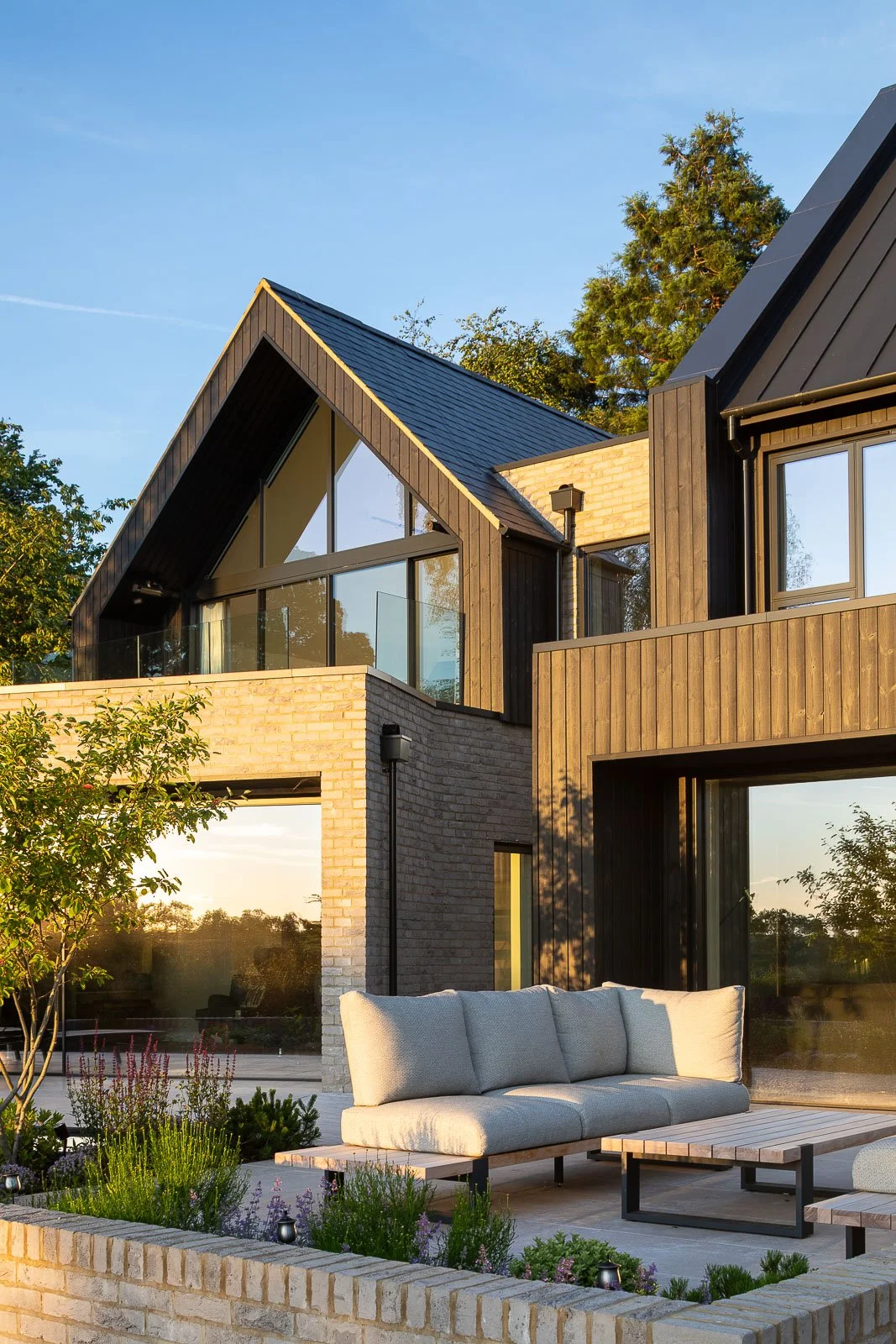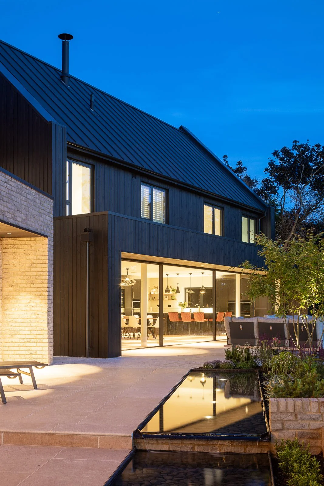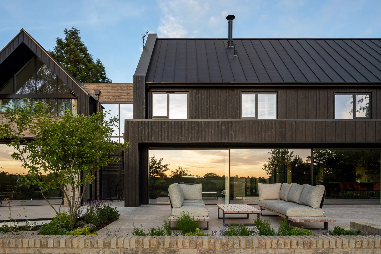 A stunning modern house designed by Leaf Architecture. We were involved from the outset on this project and the results are spectacular. The first part of the brief was to ensure that the views out across the countryside were not interrupted and the extensive use of glass on the house ensured the connection to the garden was of paramount importance to the overall success of the whole project. The garden falls away from the house and a large terrace wraps across the main living spaces. This is broken up with a flat water canal and limestone pavers. To the side of the house is a destination arbour and BBQ space. This makes the most of the views without interrupting them. Multi-stem trees add a layer of height and the planting helps set the building within the countryside setting.